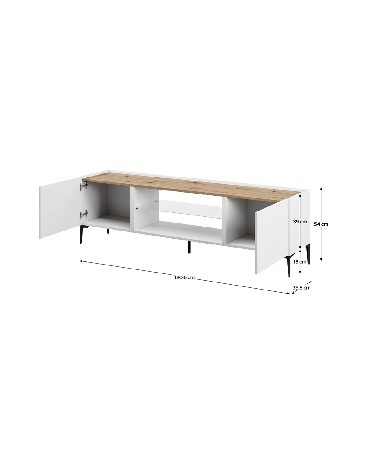 - Este mueble TV combina blanco y madera natural en un diseño moderno y muy práctico, perfecto para salones que buscan estilo y ligereza visual. Sus dos puertas laterales y el estante central ofrecen espacio suficiente para organizar dispositivos, libros o accesorios del día a día. Su estructura de 180 cm de ancho, junto con sus patas metálicas de 15 cm, aporta estabilidad y un toque elegante. Incluye estante interior para mantener todo bien ordenado y accesible. Fabricado en tablero laminado resistente y equipado con bisagras y guías metálicas para un uso cómodo y duradero.