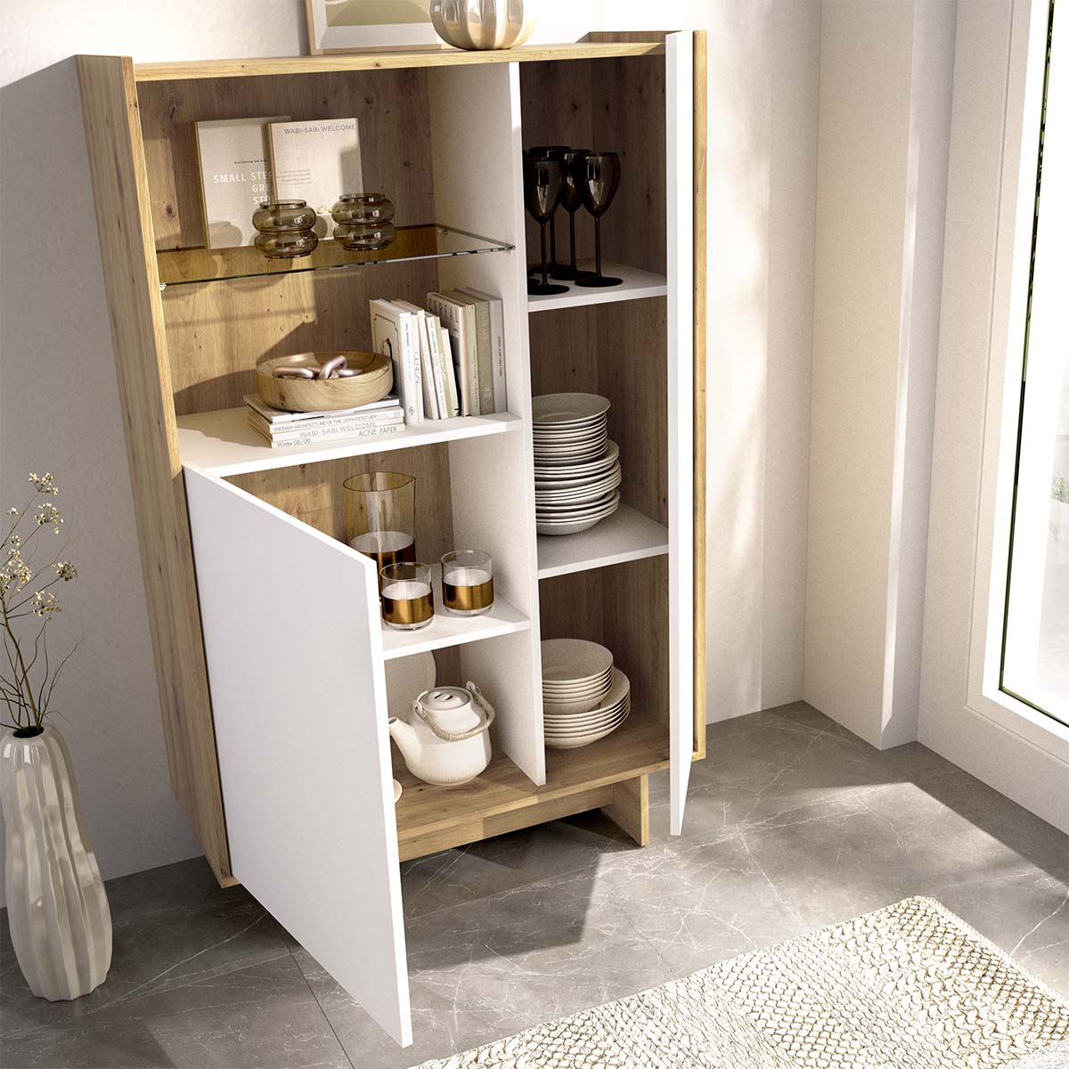 - El conjunto KA de mueble TV y vitrina combina dos piezas complementarias pensadas para crear una zona de salón equilibrada y funcional. El mueble TV aporta una base baja y ligera para organizar dispositivos y accesorios, mientras que el aparador vertical amplía la capacidad de almacenaje sin sobrecargar el espacio. El acabado en blanco y nordic unifica el conjunto con un estilo luminoso y actual. El mueble TV incorpora puerta con compás de gas abatible, facilitando un acceso cómodo y silencioso al interior, ideal para mantener cables y mandos ordenados. Por su parte, el aparador cuenta con dos puertas y estantes regulables que permiten adaptar el interior a distintos usos, desde vajilla hasta objetos decorativos o documentos, ofreciendo versatilidad en el día a día. Ambas piezas están fabricadas en tablero de partículas melaminizado de 16 mm, un material resistente y de fácil mantenimiento. Incluyen tacos ABS quitarruidos y antirrayaduras para proteger el suelo, y comparten una altura de patas de 15 cm que refuerza la sensación de ligereza visual. Un conjunto práctico y coherente para salones que buscan orden y diseño.