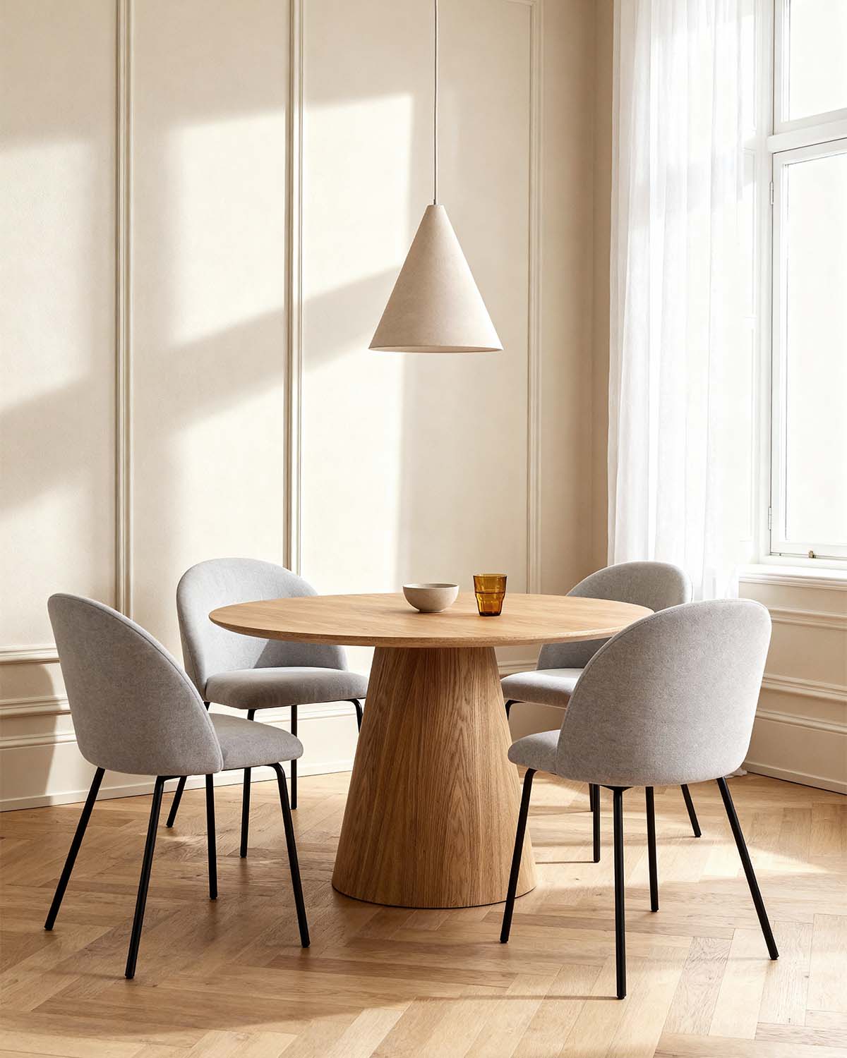 - Este conjunto une la mesa redonda Bertha en MDF de 120 cm en color madera natural con cuatro sillas Grace tapizadas en gris. Es una combinación cálida y versátil que encaja en ambientes nórdicos y contemporáneos. La mesa ofrece firmeza y un acabado natural fácil de coordinar, mientras que las sillas, con patas de metal negras, aportan soporte sólido y un asiento confortable para el día a día. Diseñado para cuatro comensales, crea un comedor práctico y estiloso, perfecto para comidas familiares y espacios de tamaño medio.