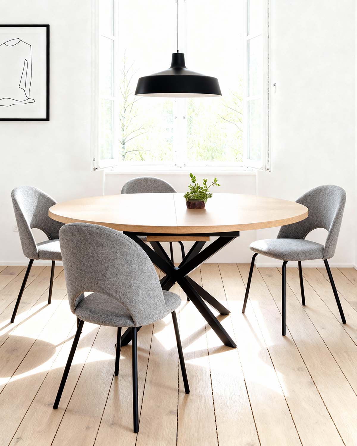 - Este conjunto une la mesa Elvia redonda extensible con cuatro sillas Lupe tapizadas en tela gris, creando un comedor práctico y visualmente equilibrado. La mesa se adapta fácilmente al espacio, pasando de 120 cm a 160 cm de diámetro para cubrir diferentes necesidades sin renunciar a la estética. Las sillas Lupe ofrecen comodidad gracias a su asiento ergonómico y tapizado resistente, pensado para un uso diario continuado. La base metálica refuerza la estabilidad y aporta un toque contemporáneo que encaja en ambientes modernos y nórdicos. La mesa Elvia cuenta con un sistema de extensión tipo mariposa, que permite ampliar la superficie de forma fluida y rápida. El tablero de MDF de 33 mm y las patas de metal aseguran firmeza y durabilidad, haciendo de este conjunto una opción funcional para hasta seis comensales.