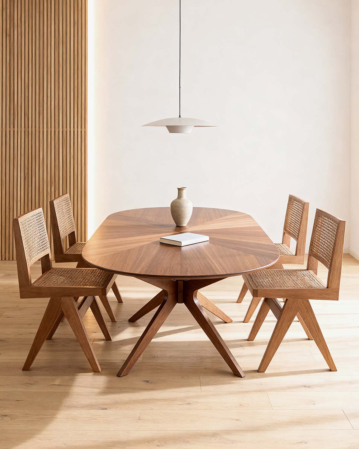 - Este conjunto une la mesa ovalada Gina en madera oscura con cuatro sillas Alana fabricadas en ratán, creando un ambiente natural y acogedor en el comedor. La forma ovalada de la mesa suaviza el espacio y facilita la interacción entre los comensales. La mesa cuenta con un sobre en MDF y patas de madera de caucho que aportan estabilidad y coherencia estética. Las sillas combinan un asiento ergonómico de ratán con una base sólida, ofreciendo comodidad y una sensación ligera que equilibra visualmente el conjunto. Una solución funcional y decorativa pensada para el uso diario, ideal para comedores que buscan un estilo cálido, natural y fácil de integrar en diferentes ambientes.