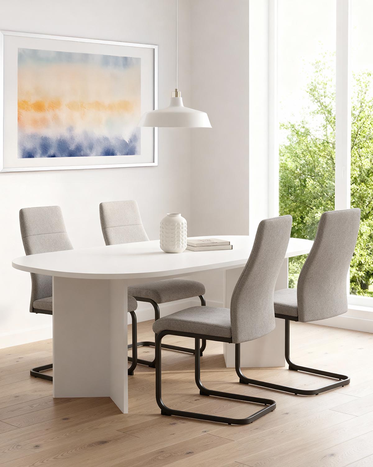 - Este conjunto combina la mesa Jacklyn en madera natural con cuatro sillas Mae tapizadas en gris, creando un comedor equilibrado y acogedor. La forma ovalada de la mesa favorece la fluidez visual y permite acomodar hasta ocho personas con comodidad, convirtiéndose en una opción ideal para reuniones y comidas diarias. Las sillas Mae destacan por su respaldo alto, que proporciona un apoyo cómodo tanto en el uso cotidiano como en sobremesas prolongadas. El tapizado en tela de poliéster aporta suavidad y resistencia, mientras que la estructura de patas metálicas garantiza estabilidad y firmeza en cada uso. Un conjunto versátil que encaja fácilmente en comedores de estilo escandinavo, mediterráneo o contemporáneo, pensado para quienes buscan funcionalidad, confort y una estética cálida y bien definida.