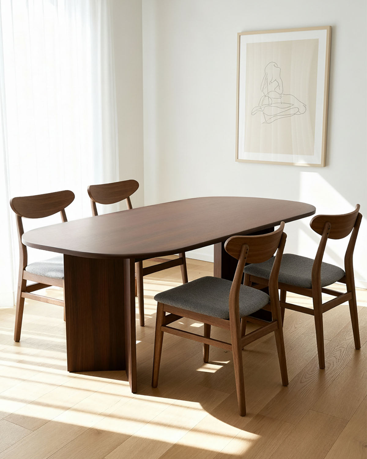 - El conjunto Jacklyn con sillas Tanya destaca por su combinación de mesa ovalada en acabado madera oscura y cuatro sillas de madera con asiento tapizado en gris oscuro. Su diseño favorece un ambiente cálido y ordenado, ideal para comedores familiares. La mesa, con tablero de 180 x 90 cm, ofrece espacio suficiente para reuniones cotidianas y ocasiones especiales. Las sillas aportan comodidad gracias a su asiento tapizado en poliéster y una estructura de madera estable, pensada para un uso prolongado. Un conjunto práctico y equilibrado que combina funcionalidad, materiales resistentes y una estética atemporal fácil de integrar.