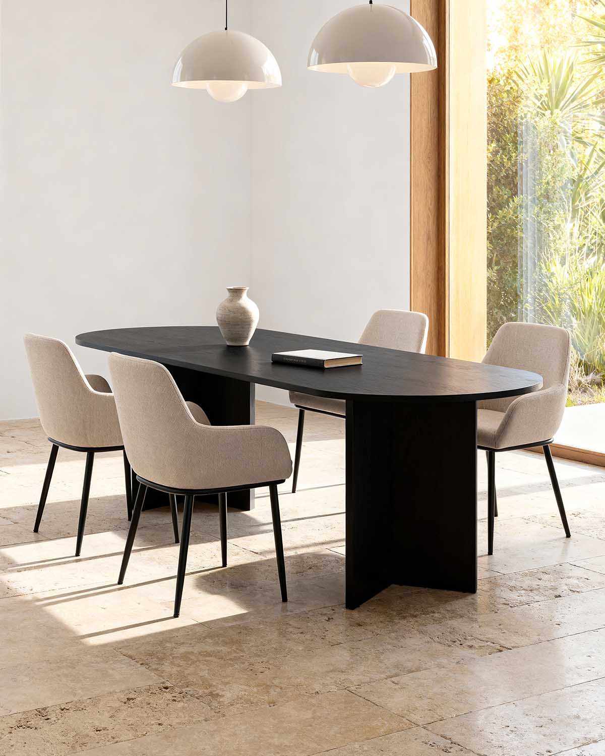 - Este conjunto reúne la mesa Jacklyn en acabado negro con cuatro sillas Verna tapizadas en tela beige, creando un contraste elegante y actual. La forma ovalada del tablero suaviza el espacio y favorece la interacción entre comensales. La mesa dispone de un amplio sobre de 180 x 90 cm fabricado en tablero melaminizado, aportando firmeza y durabilidad. Las sillas, con estructura metálica, ofrecen estabilidad y confort gracias a su asiento ergonómico y tapizado resistente. Una propuesta funcional y versátil, pensada para comedores que buscan diseño, comodidad y materiales preparados para el uso diario.