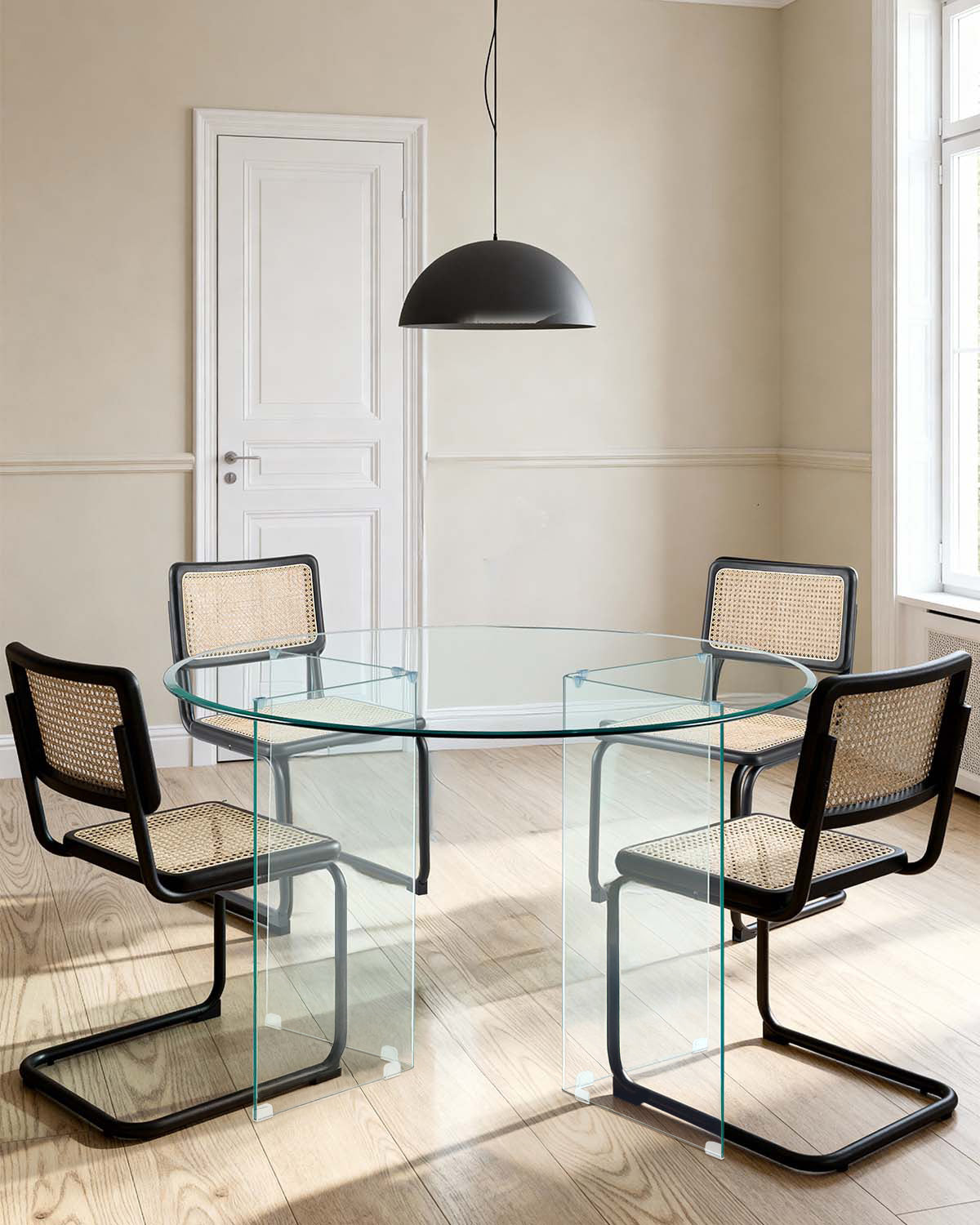 - El conjunto Mia y Karyn combina una mesa redonda de cristal templado de 137 cm con cuatro sillas de ratán en color negro. Su diseño equilibrado une transparencia y ligereza visual con materiales resistentes, perfectos para crear un ambiente actual en cualquier comedor. La mesa ofrece una superficie amplia y estable, ideal para comidas diarias o encuentros informales. El cristal templado aporta durabilidad y facilita la limpieza, mientras la forma redonda favorece la comodidad al distribuir mejor el espacio entre comensales. Las sillas Karyn, fabricadas en ratán con estructura de acero, aportan firmeza y un estilo natural que contrasta con la mesa. Su diseño envolvente mejora el confort y crea un conjunto funcional y decorativo, pensado para hogares que buscan estilo y practicidad sin renunciar a la resistencia.