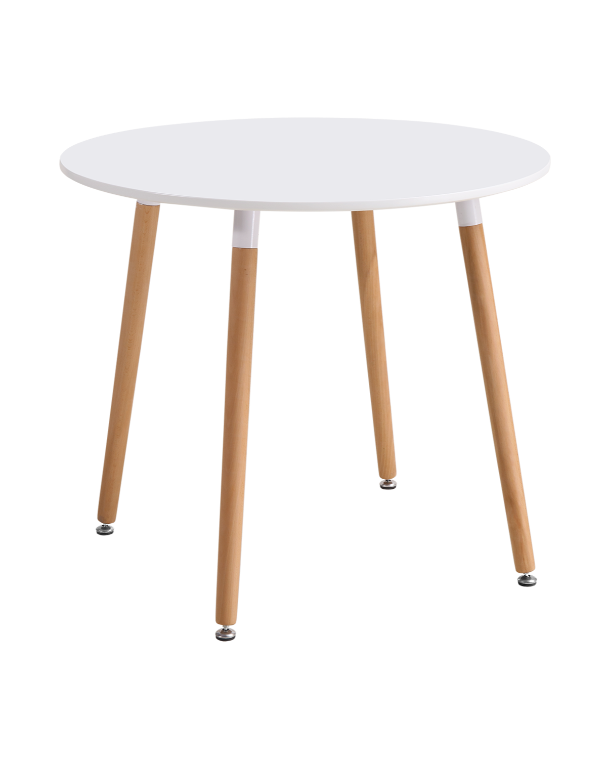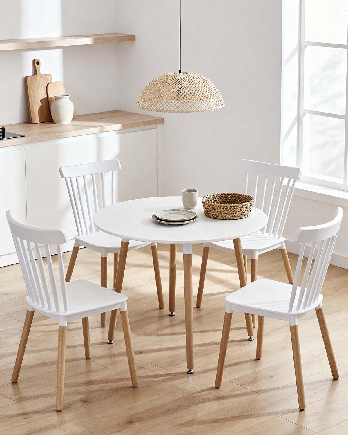 - El conjunto Nola y Kaye combina una mesa redonda de 90 cm de diámetro en blanco y madera natural de MDF con patas de haya. Su diseño compacto facilita la circulación y aporta un aire luminoso al comedor o cocina. Las cuatro sillas Kaye, fabricadas en plástico blanco con patas de madera de haya, ofrecen ligereza y estabilidad. Su acabado hace que sean fáciles de mover y limpiar, perfectas para el uso diario. Con un estilo moderno y natural, este conjunto crea un ambiente acogedor y equilibrado. Su composición resistente y su formato redondo lo convierten en una opción ideal para optimizar el espacio sin renunciar al diseño.