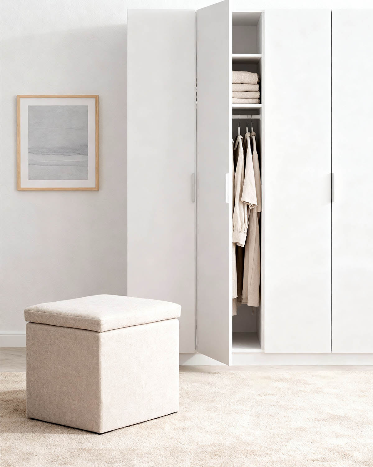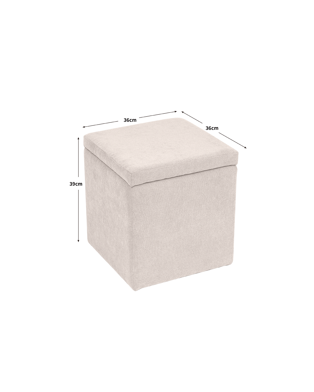 - El puff con almacenaje Jayne en color beige es una opción práctica y decorativa para completar cualquier estancia. Su diseño compacto permite utilizarlo como asiento auxiliar o reposapiés, mientras que su interior ofrece un espacio de almacenaje discreto para mantener el orden en el hogar. Tapizado en tejido resistente y agradable al tacto, cuenta con un relleno de espuma de 23 kg/m³ que garantiza comodidad en el uso diario. El acabado en beige aporta luminosidad y calidez, facilitando su integración en ambientes modernos, nórdicos o naturales. Un puff funcional y versátil que combina comodidad, almacenaje y un diseño atemporal, perfecto para sumar orden y estilo a cualquier espacio.
