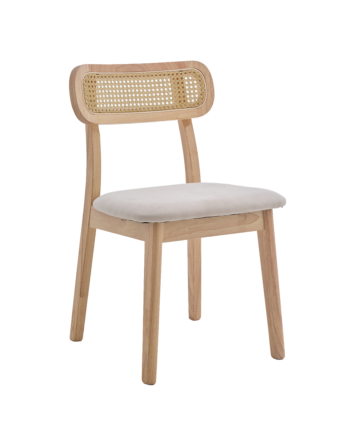 Silla en madera y ratán en color natural con asiento tapizado en tela beige