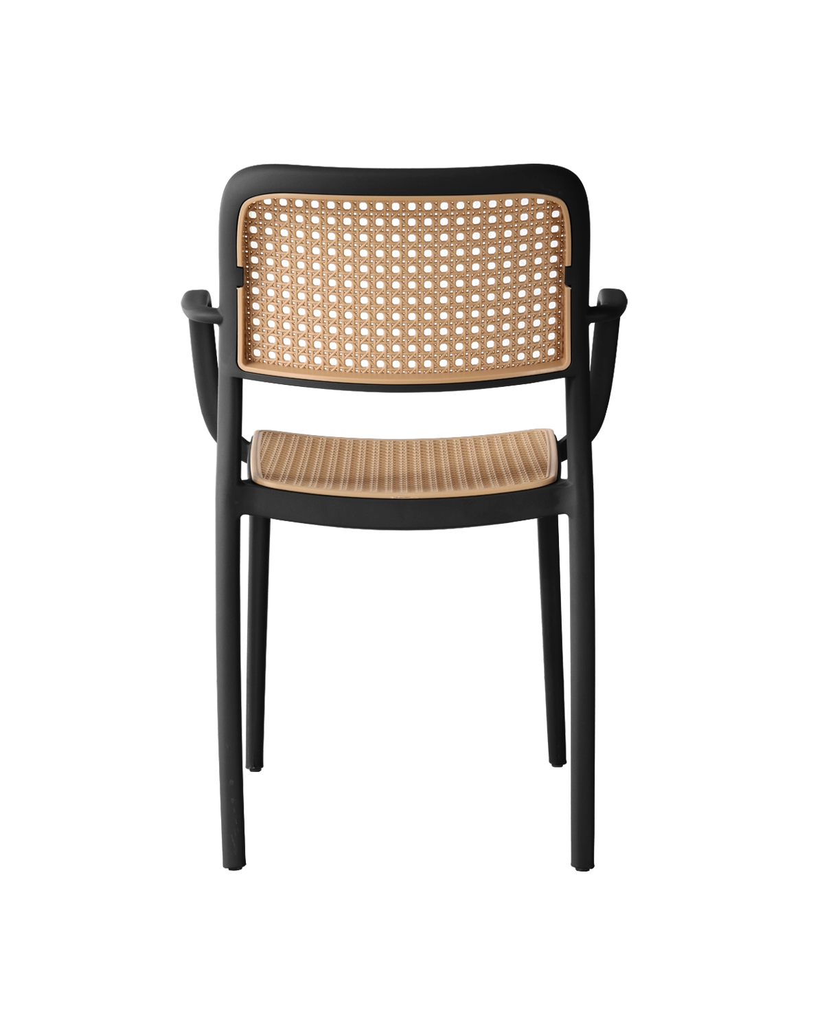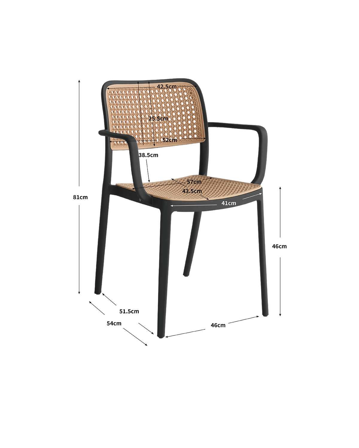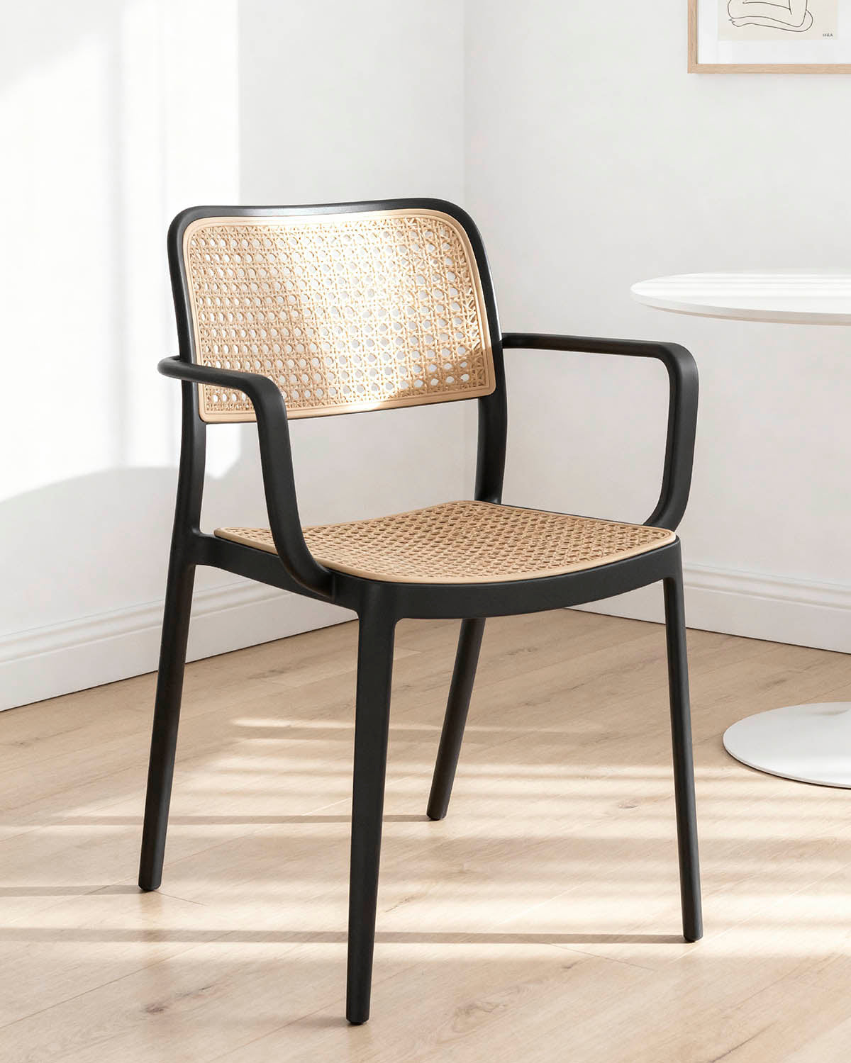 - Silla comedor con reposabrazos en polipropileno Tammy Negro combina diseño funcional y estética actual, convirtiéndose en una opción práctica para el comedor o la cocina. El acabado en negro refuerza la sensación de luminosidad y versatilidad en la estancia. Su carácter atemporal permite integrarla en distintos conjuntos de comedor o utilizarla como asiento auxiliar en otras estancias. Pensada para el día a día, combina confort y facilidad de limpieza sin perder presencia decorativa. Fabricada en polipropileno tratado para exterior, ofrece resistencia y un mantenimiento sencillo, el asiento ergonómico asegura comodidad durante las comidas y la estructura soporta hasta 120 kg, lo que la convierte en una pieza duradera. Un diseño versátil que se integra en ambientes modernos, nórdicos o minimalistas, ideal para completar el espacio con estilo y practicidad.
