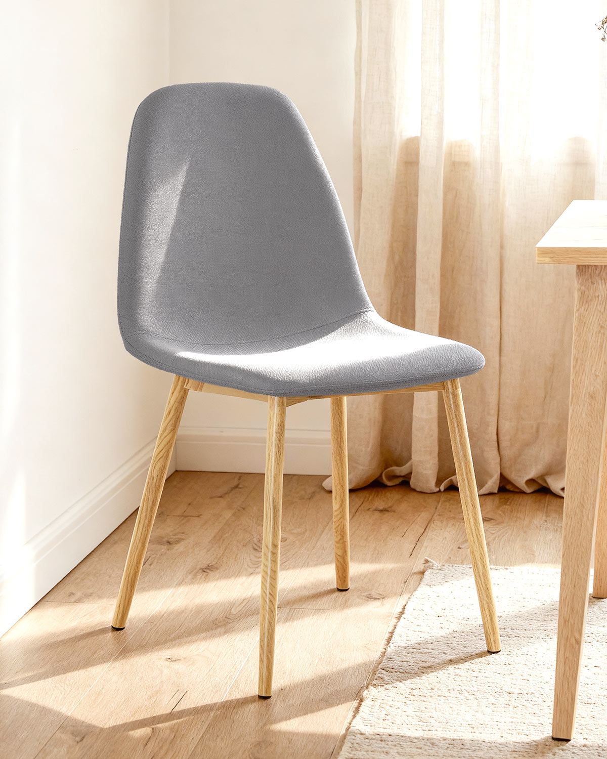 - Silla comedor tapizada en tela Deana Gris combina diseño funcional y estética actual, convirtiéndose en una opción práctica para el comedor o la cocina. El acabado en gris refuerza la sensación de luminosidad y versatilidad en la estancia. Su carácter atemporal permite integrarla en distintos conjuntos de comedor o utilizarla como asiento auxiliar en otras estancias. Pensada para el día a día, combina confort y facilidad de limpieza sin perder presencia decorativa. Fabricada en tela, ofrece resistencia y un mantenimiento sencillo, el asiento ergonómico asegura comodidad durante las comidas, la base en metal garantiza estabilidad y aporta un toque contemporáneo y la estructura soporta hasta 130 kg, lo que la convierte en una pieza duradera. Un diseño versátil que se integra en ambientes modernos, nórdicos o minimalistas, ideal para completar el espacio con estilo y practicidad.