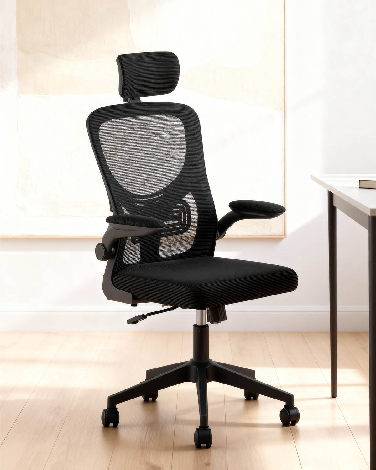 - La silla de escritorio Maude destaca por su respaldo alto, pensado para ofrecer un mayor soporte de la espalda durante largas jornadas frente al escritorio. Su sistema de altura regulable permite ajustar el asiento a distintas posiciones, mejorando la ergonomía y adaptándose a diferentes usuarios y superficies de trabajo. El asiento es amplio y cómodo, con un tapizado en tejido que aporta suavidad y confort en el uso diario. La función giratoria facilita los movimientos sin necesidad de levantarse, optimizando la dinámica de trabajo. Su mayor peso transmite sensación de solidez y estabilidad. Fabricada con patas de plástico resistentes y preparada para soportar hasta 120 kg, la silla Maude es una opción funcional para oficinas, despachos o zonas de estudio. Su diseño sobrio en color negro encaja con facilidad en espacios profesionales que priorizan comodidad y uso continuado.