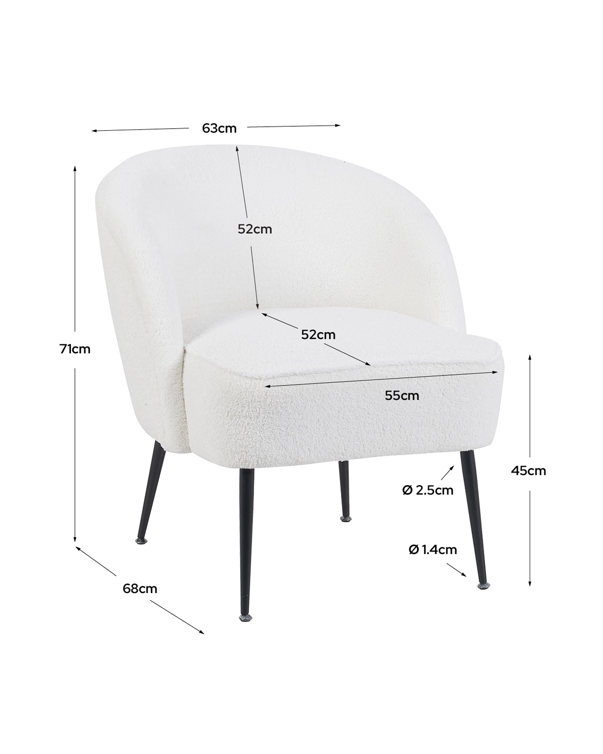 - El sillón tapizado en teddy Emma combina suavidad y diseño contemporáneo, aportando calidez a cualquier estancia. El acabado en blanco realza la luminosidad del espacio y transmite una atmósfera serena. Su asiento mullido invita al descanso cotidiano, mientras que el tapizado en teddy destaca por su textura acogedora y fácil mantenimiento. Las patas metálicas aportan un aire moderno y aseguran estabilidad, al mismo tiempo que la estructura soporta hasta 120 kg sin perder confort. Una pieza versátil que encaja en decoraciones nórdicas, clásicas o actuales, capaz de convertirse en punto focal y de añadir un toque acogedor y elegante al conjunto.