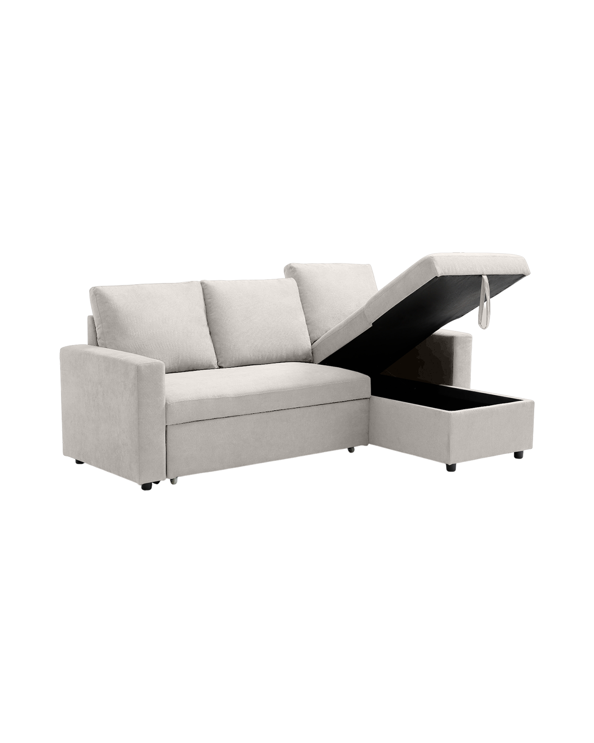 - Sofá cama con chaise longue reversible y almacenaje Ivy Beige es una pieza práctica que une funcionalidad y estilo, pensada para optimizar espacios reducidos sin renunciar a la comodidad. El acabado en beige aporta frescura y versatilidad, ideal para distintos estilos de decoración. Su diseño atemporal permite integrarlo en ambientes modernos, nórdicos o clásicos, aportando confort en el uso diario. Tapizado en poliéster, ofrece una textura suave y fácil de mantener, su formato de 3 plaza lo convierte en una solución compacta para hogares modernos, el sistema arrastre permite un uso sencillo y práctico y las patas de plástico aportan estabilidad y un toque natural. Un sofá cama versátil que funciona como asiento de día y cama auxiliar de noche, perfecto para salones pequeños, dormitorios juveniles o espacios multifuncionales.