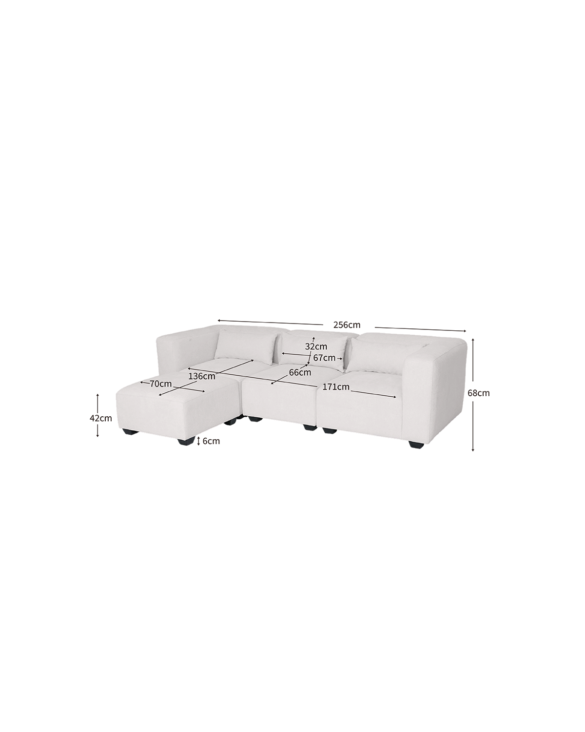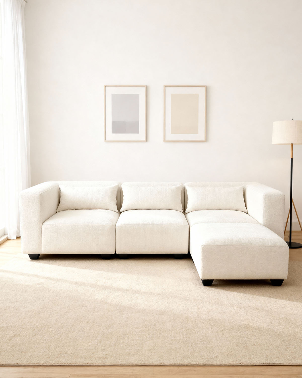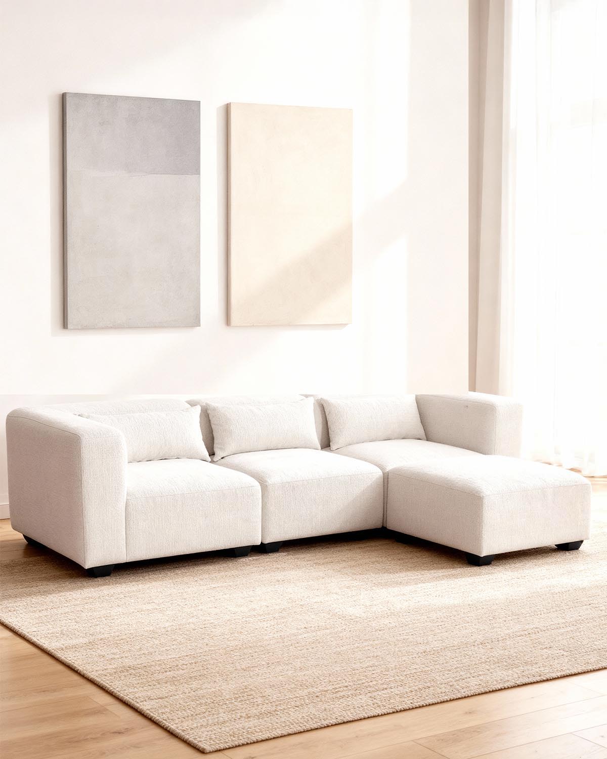 - El sofá modular Liza con reposapiés, en su versión de tres plazas, está compuesto por cuatro módulos independientes. El módulo adicional funciona como reposapiés o chaise longue, y puede colocarse a cualquiera de los lados del sofá, adaptándose así a diferentes distribuciones del espacio. Su tapizado en color beige aporta serenidad y una sensación de amplitud visual. Las formas redondeadas, el respaldo bajo y los reposabrazos anchos crean una estética contemporánea y acogedora, ideal para zonas de estar o espacios compartidos. El módulo de reposapiés añade versatilidad, ofreciendo un plus de confort para el descanso. Fabricado con estructura de madera y espuma de densidad media (25 kg/m³ en el asiento), combina resistencia y confort. Las patas bajas de plástico mantienen la estabilidad y el aspecto ligero del conjunto. Requiere un montaje sencillo y su mantenimiento es fácil, con una limpieza periódica mediante un paño humedecido.