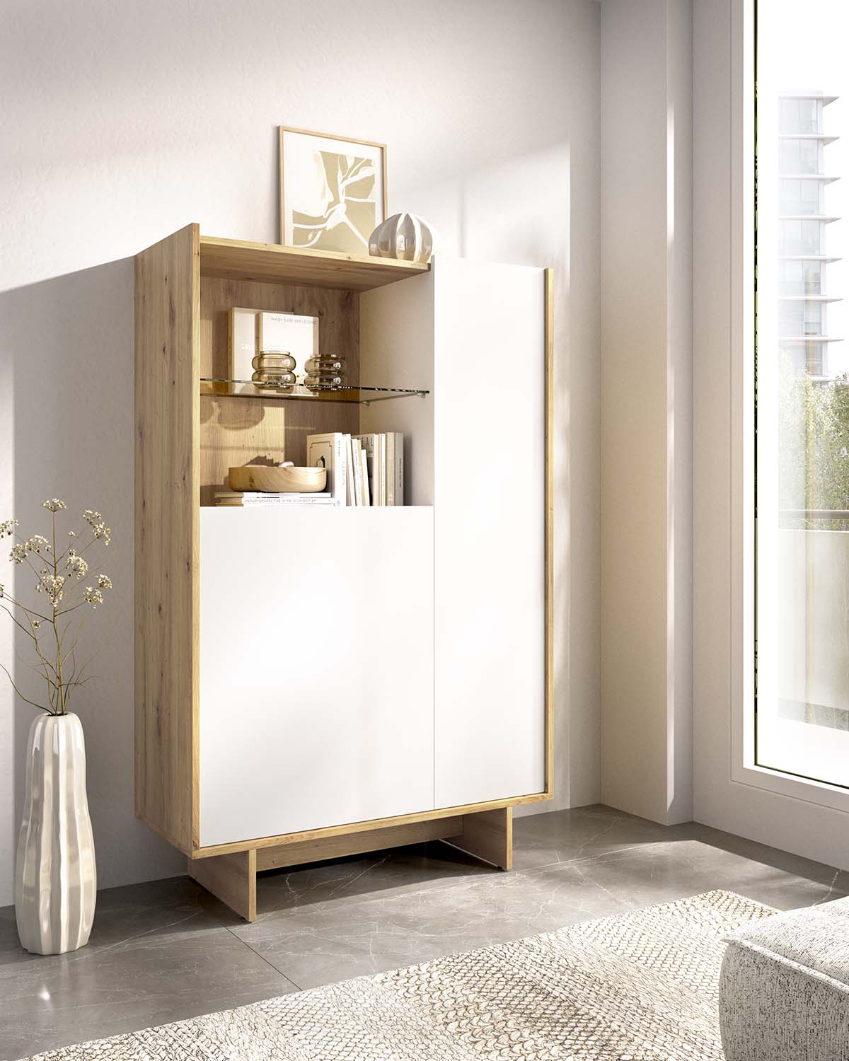 - La vitrina KA ofrece una solución de almacenaje vertical pensada para mantener el orden sin recargar el espacio. Con 80,5 cm de ancho y 137,7 cm de alto, resulta ideal para salones o comedores que necesitan capacidad adicional con un diseño ligero en blanco y nordic. Dispone de dos puertas y estantes interiores regulables, lo que permite adaptar el interior a diferentes tipos de objetos, desde vajilla hasta libros o textiles. Incluye estantes y sistema de fijación a pared, aportando seguridad y estabilidad en el uso diario sin renunciar a una distribución práctica. Fabricado en tablero de partículas melaminizado de 16 mm, garantiza resistencia y fácil mantenimiento. Incorpora tacos ABS quitarruidos y antirrayaduras para proteger el suelo, mientras que sus patas de 15 cm refuerzan una estética equilibrada y funcional.