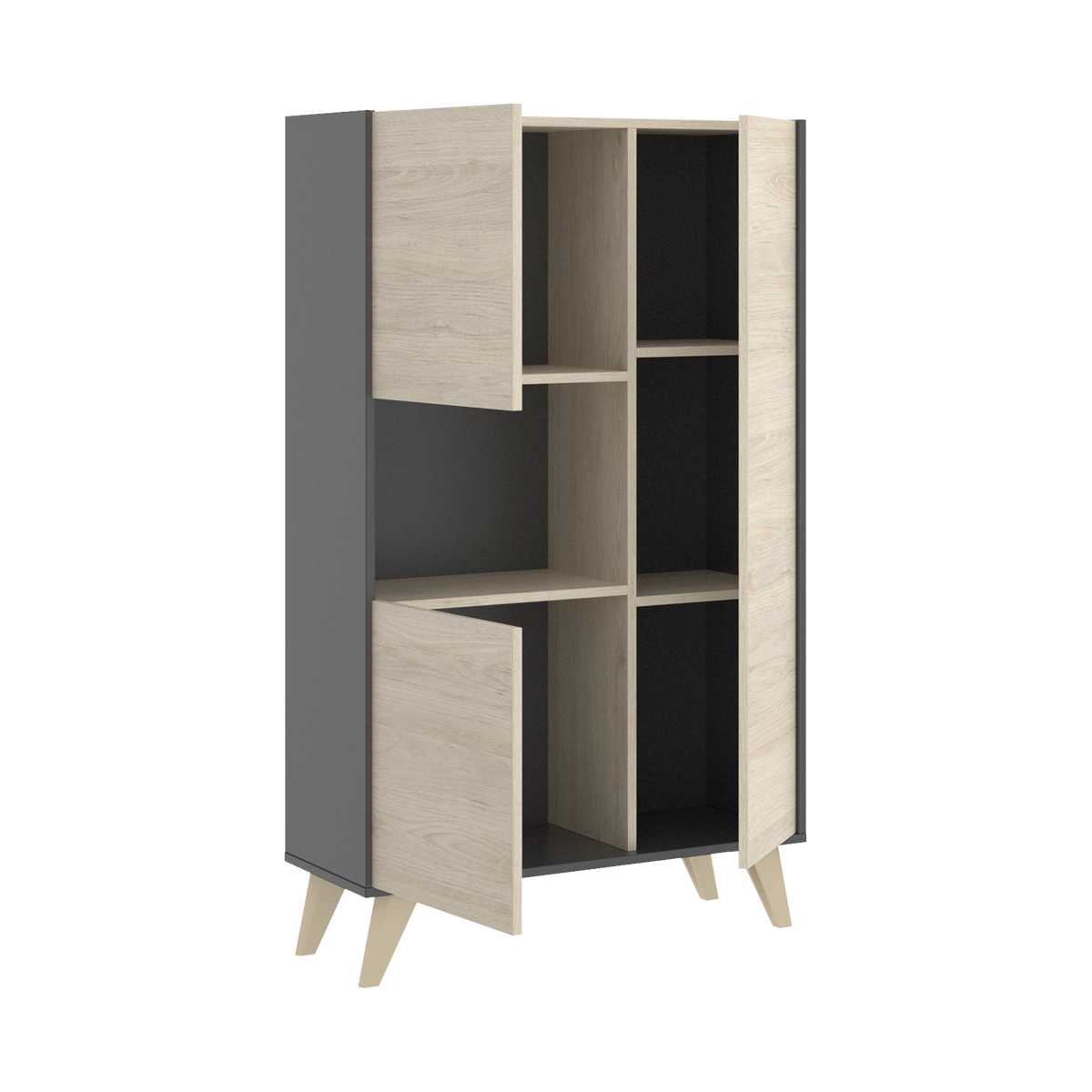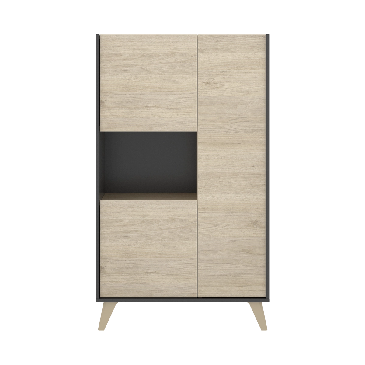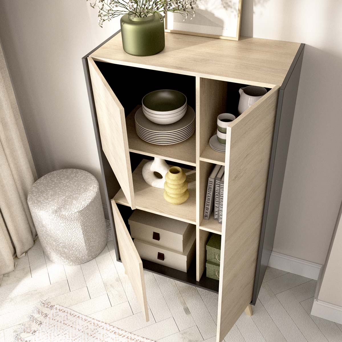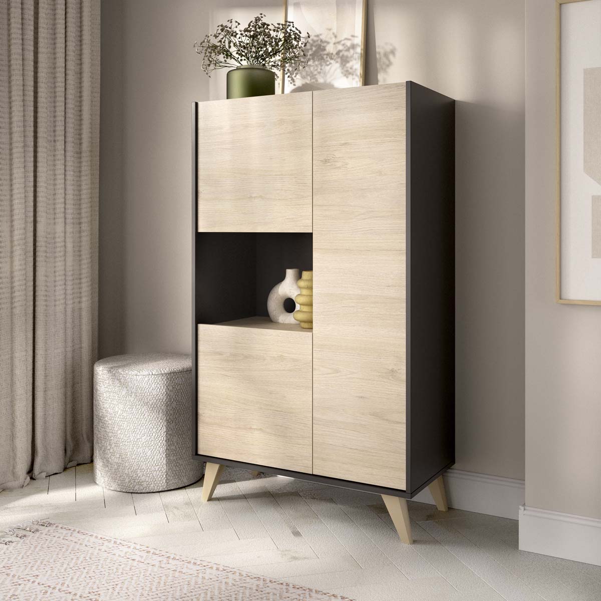 - La vitrina Ness en acabado grafito y madera natural es una pieza elegante y equilibrada que combina almacenaje funcional y presencia decorativa. Su diseño de inspiración nórdica destaca por la pureza de sus líneas y la calidez de los materiales, aportando personalidad y serenidad a cualquier ambiente. Construida en tablero de partículas melaminizado, ofrece tres puertas que combinan zonas cerradas y acristaladas, ideales para organizar y exhibir objetos. Las patas en ABS con acabado roble natural elevan la pieza, aportando estabilidad y una estética ligera. Su interior amplio facilita mantener el orden con estilo. El contraste entre el tono grafito y el roble natural refuerza su carácter contemporáneo, creando un juego visual sobrio y acogedor. Una vitrina versátil que combina diseño, resistencia y una elegancia discreta que perdura en el tiempo.